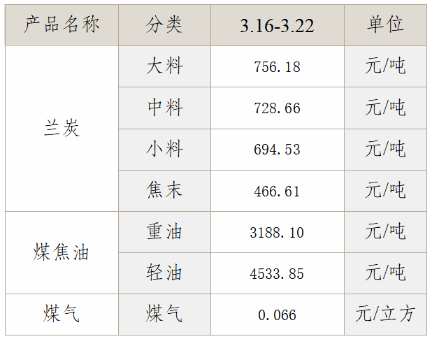 兰炭及其附属产品平均价格(2026.3.16-3.22)