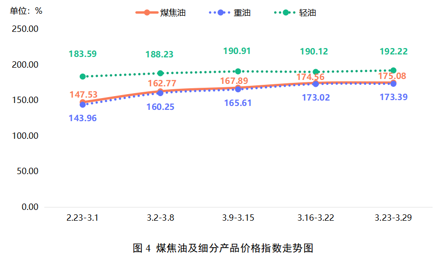 本期,煤焦油价格指数收报于175.08点,环比略涨0.30%。分析来看,近期煤焦油市场呈现价格上涨但涨幅收窄的走势。分析来看,其上涨主要受前期国内成品油零售价上调政策落地带动,对市场情绪形成短期提振;而涨幅收窄则因近期国际油价走弱,导致国内成品油市场预期转淡,进而使得下游加氢企业压价心态增强,同时煤焦化厂出货意愿增加,市场供应趋于宽松。因此,在成本传导与下游压价的博弈下,煤焦油价格虽受成品油提涨带动上行,但受需求端预期走弱及供应释放影响,上涨动力逐渐减弱,短期内价格预计以窄幅波动、涨幅收缓为主。细分产品中,重油、轻油价格指数均有上升,本期涨幅分别为0.21%、1.11%。