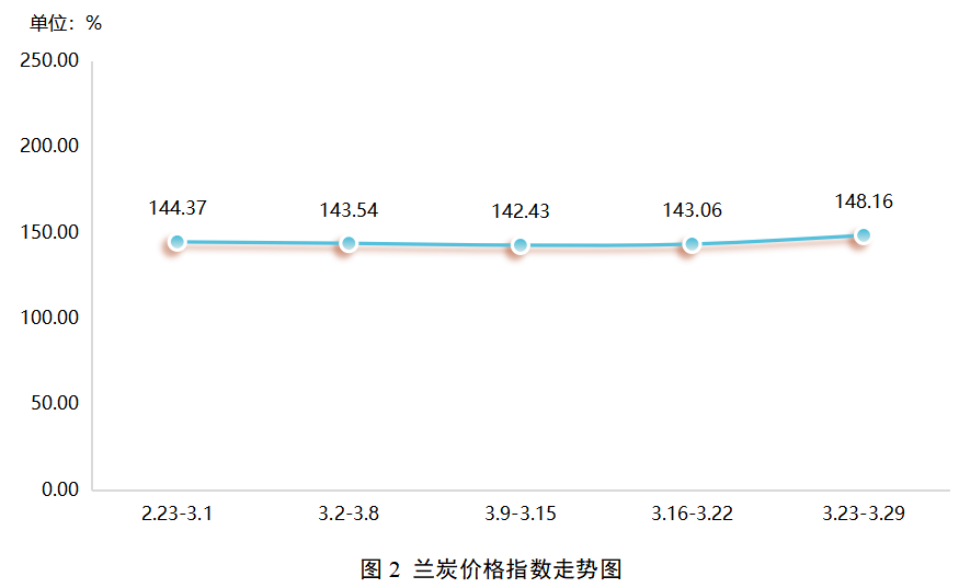 本期,兰炭价格指数收于148.16点,环比上升3.56%。