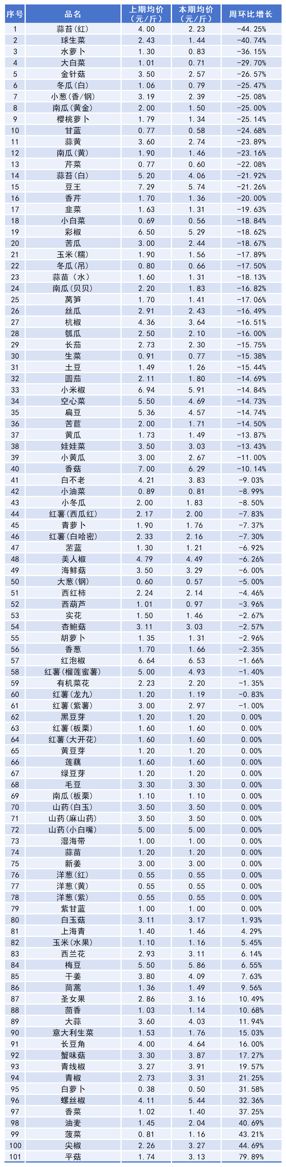 从具体蔬菜品种来看,价格上涨的有22种,价格下跌的有61种,持平的有18种。