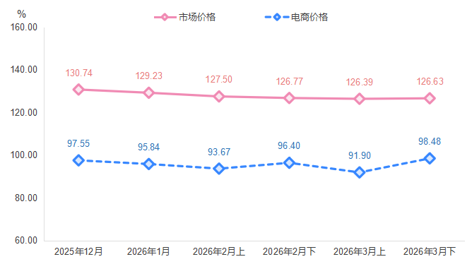 电商价格指数波动幅度显著大于市场价格指数。1月,指数收于95.84点,2月上半月下跌至93.67点后下半月反弹至96.40点,3月上半月回落至91.90点,下半月则大幅上涨7.16%至98.48点。其中,小菠萝电商指数季度内维持高位运行,指数从156.83点一路上涨至178.17点,创下季度新高,而凤梨16号等传统大果线上价格持续承压,整体呈现“小果热、大果冷”的结构性特征。
