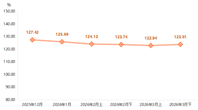 3月上半月,新果上市节奏平缓、电商平台比价效应加剧影响,指数微跌0.65%。下半月,徐闻菠萝开始集中上市,处于年度产销黄金盛期,市场呈现供应充足但结构性偏紧、需求旺盛且多元支撑格局,价格指数上涨至123.81点,较3月上半月上涨0.71%。