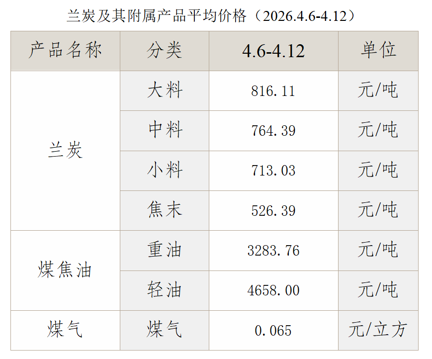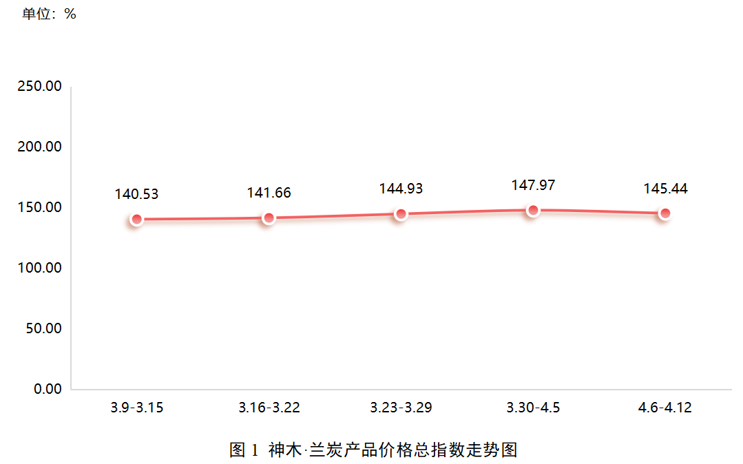 本期(2026.4.6-4.12,下同),神木兰炭市场偏弱运行。据“神木·中国兰炭产业指数”信息系统监测,本期兰炭产品价格总指数收于145.44点,环比下降1.71%。细分产品中,大中小料、焦末和重油价格指数小幅下降,煤气价格指数持平,轻油价格指数上涨。