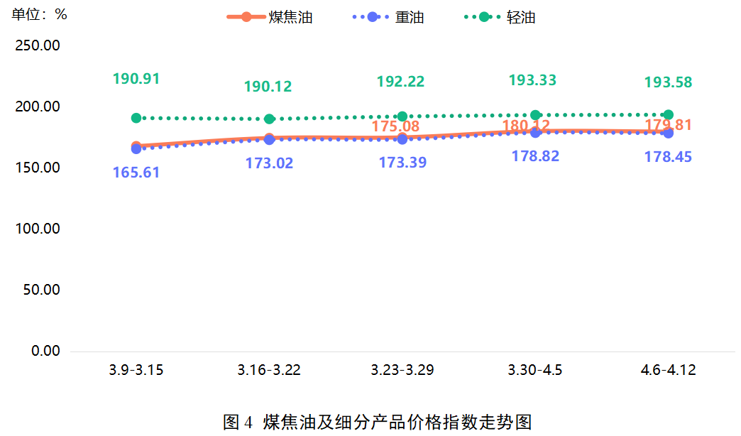 本期,煤焦油价格指数收报于179.81点,环比下降0.17%。分析来看,随着地缘局势缓和导致国际油价回调,市场观望情绪明显增强,需求跟进有所放缓,价格随之承压趋稳并小幅松动,短期价格预计延续震荡整理格局。细分产品中,重油价格指数略降0.21%;轻油价格指数则继续上升,涨幅为0.13%。