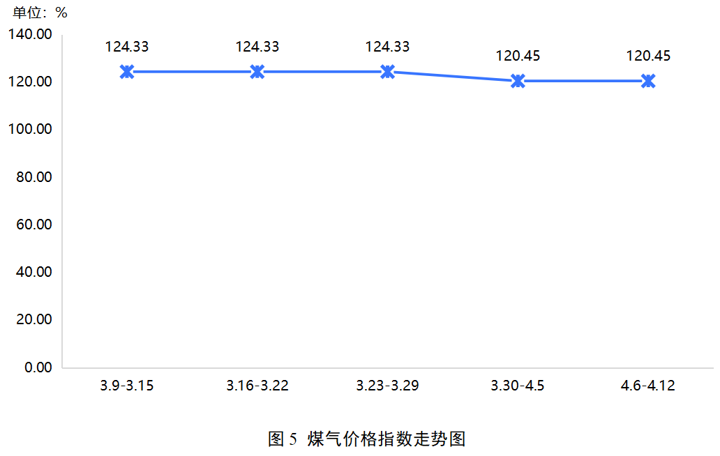 本期,煤气价格指数收于120.45点,环比持平。