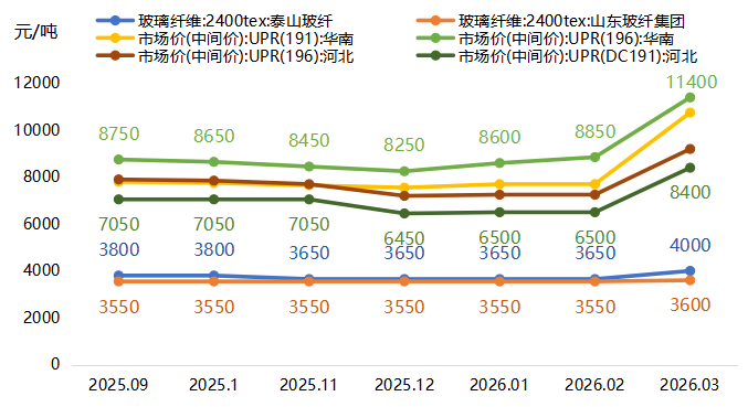 2026年一季度,玻璃纤维价格呈低位企稳、小幅回升态势,而不饱和树脂价格则在3月出现大幅跳涨,两者走势明显分化。