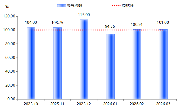 2026年一季度,复合材料产业景气指数呈逐月修复态势,但过程较为艰难。1月指数为94.55点,低于荣枯线;2月指数突破荣枯线,回升至100.91点;3月指数进一步微升至101.00点,景气运行但基础尚不牢固。