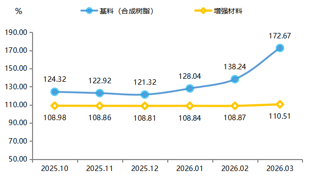 基料价格指数大幅上涨。截至2026年3月,基料价格指数收报于172.67点,环比涨幅高达24.90%,较2025年12月上涨42.32%,成为拉动复合材料原料价格指数上行的绝对主力。其背后原因复杂:一是原油、苯乙烯等大宗商品价格在一季度出现快速上涨,成本传导效应集中显现;二是2025年持续的去库存周期后,下游备货需求在2026年春节后有所释放,阶段性供需错配推高了基料价格。