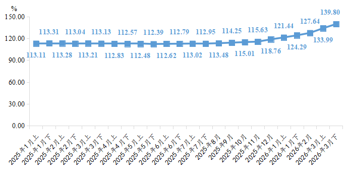 3月,指数涨势继续扩大,上升至 130.00 点以上的高位。
