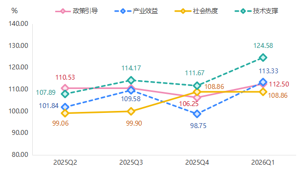 其中,技术支撑和产业效益指数涨势较为显著,指数分别为124.58点、113.33点。