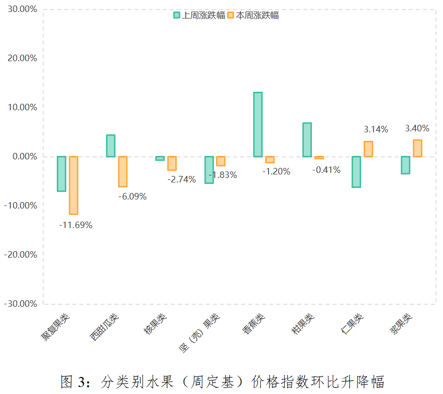 本期监测的八大类水果品类中:除仁果类(3.14%)、浆果类(3.40%)水果价格指数本期止降为升外,其余六类水果价格指数本期均呈现下降态势。其中,聚复果类(-11.69%)、核果类(-2.74%)水果价格指数本期降幅均有所扩大;西甜瓜类(-6.09%)、香蕉类(-1.20%)、柑果类(-0.41%)水果价格指数本期由升转降;坚(壳)果类水果价格指数本期降幅收窄至1.83%。