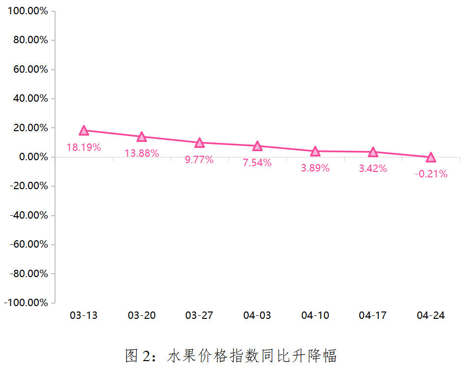 同比来看,本期水果价格指数相较去年同期处于较低水平,本期同比降幅为0.21%。