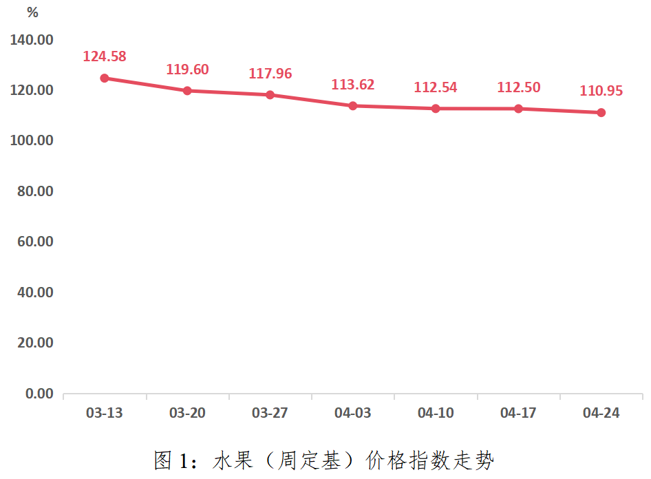 据“南大堡市场蔬果指数”信息系统监测,本期水果(周定基)价格指数延续下行趋势,收于110.95点,环比下降1.37%。