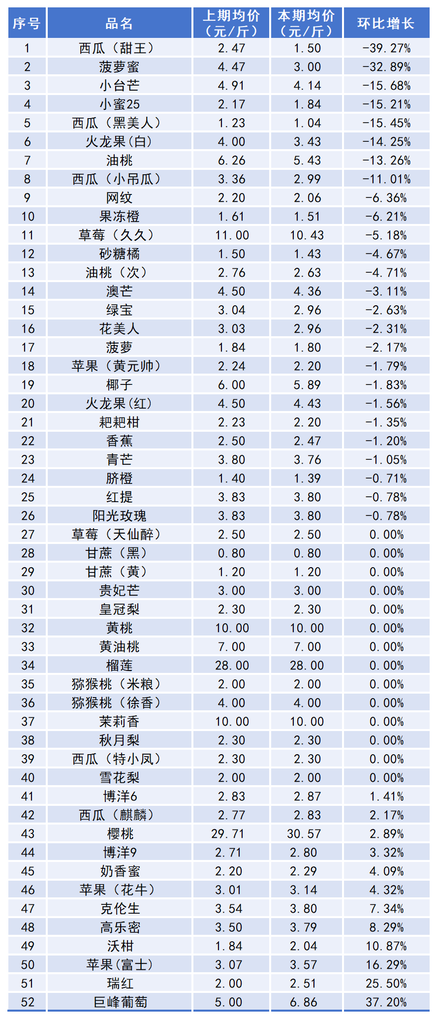 从具体水果品种来看,价格上涨的有12种,占总水果品种的23.08%,其中巨峰葡萄本期均价6.86元/斤,上期均价5.00元/斤,环比涨幅达37.20%;价格下跌的有26种,占总水果品种的50.00%,其中甜王西瓜本期均价1.50元/斤,上期均价2.47元/斤,环比下跌39.27%;价格持平的有14种。
