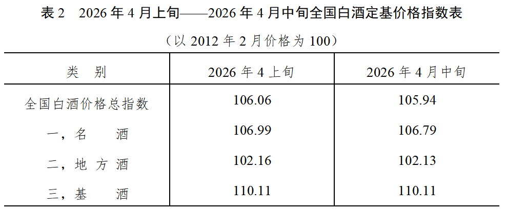 从定基价格指数看,2026年4月中旬全国白酒商品批发价格定基总指数为105.94,上涨5.94%。其中,名酒定基价格指数为106.79,上涨6.79%;地方酒定基价格指数为102.13,上涨2.13%;基酒定基价格指数为110.11,上涨10.11%。(见表2)