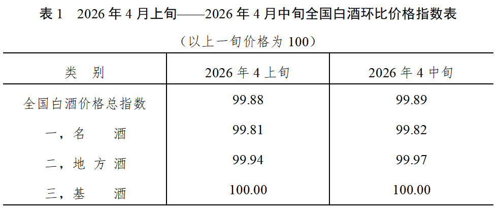 泸州·中国白酒商品批发价格指数办公室发布的数据显示,2026年4月中旬全国白酒环比价格总指数为99.89,下跌0.11%。从分类指数看,名酒环比价格指数为99.82,下跌0.18%;地方酒环比价格指数为99.97,下跌0.03%。基酒环比价格指数为100.00,保持稳定。(见表1)