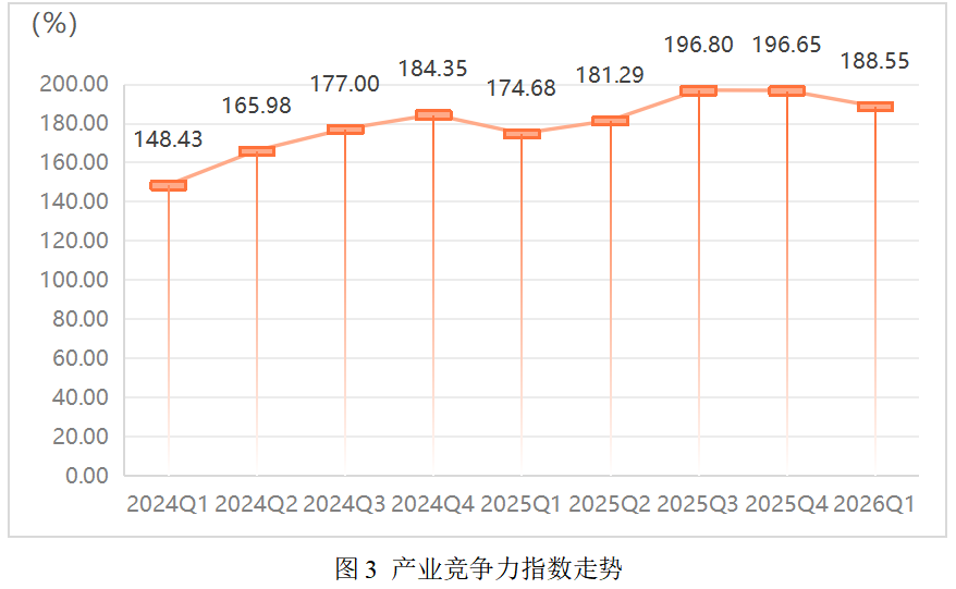 2026年一季度,产业竞争力指数延续周期性走势,回落至188.55点,环比下降4.12%,但同比仍提升13.87个百分点,整体运行依旧稳健。综合分析,一季度指数阶段性走低,属于行业季节性常态表现,主要受春节假期扰动、生产节奏放缓、资金周转收紧及政策衔接调整等多重共性因素影响。一是一季度为制造业传统淡季,叠加春节长假因素,企业普遍安排停工减产、设备检修,生产产能、订单交付效率与供应链流转速度同步放缓,行业整体运行活力有所回落。二是年初集中结算年度税费、发放年终薪酬,加之节日期间市场交易放缓、资金回笼周期拉长,企业现金流承压加剧,一定程度制约生产经营扩张节奏。三是年末各类产业扶持、惠企政策集中兑现落地,进入一季度后,相关政策进入衔接调整周期,新兴扶持举措尚处在谋划筹备、落地过渡期,短期政策拉动效应有所弱化。