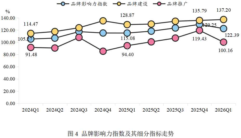 2026年一季度,品牌影响力指数基本平稳运行,为122.39点,环比下降5.31%。细分来看,品牌建设和品牌推广两项二级指数表现为“一升一降”。