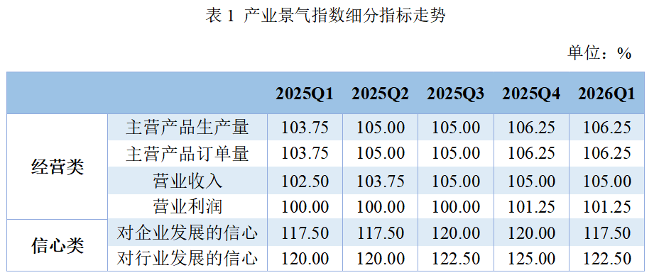 产业景气指数方面,二季度预计继续保持在扩张区间运行。经营类指标中,生产量、订单量、营业收入等关键指标有望在一季度基础上稳中有升,但营业利润改善幅度可能有限,成本压力与市场竞争仍是主要制约因素。信心类指标方面,一季度企业发展信心为117.50点、行业发展信心为122.50点,仍处于较高景气区间,随着下游需求逐步释放、政策利好持续落地,企业对未来发展的信心有望保持坚挺。