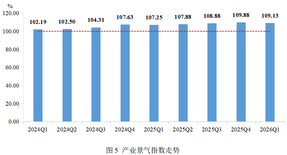 2026年一季度,产业景气指数稳定保持在扩张区间运行,为109.13点,环比窄幅回落,但高于上年同期1.88个百分点,显示出行业景气度稳中向好。
