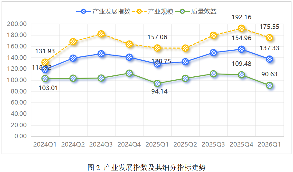 2026年一季度,产业发展指数运行偏弱,为137.33点,环比下降11.29个百分点。细分来看,产业规模和质量效益两项二级指数均有不同程度的回落。