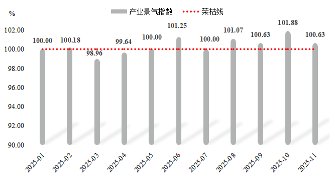 11月,衡水工程橡胶产业景气指数表现良好,收于100.63点,高出荣枯线0.63点,位于景气区间。具体运行情况如下图所示: