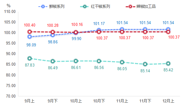 开鲁辣椒产品价格指数设计包含鲜椒系列、红干椒系列和辣椒加工品三大类。其中,鲜椒系列价格指数辣椒加工品价格指数分别稳定在101.54点、100.37点,红干椒系列价格指数小幅上涨,指数为85.42点,较11月下半月上涨0.33%,具体运行情况见下图: